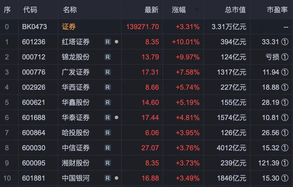 证券板块里,红塔证券、锦龙股份涨停,华泰证券、广发证券等涨幅居前。